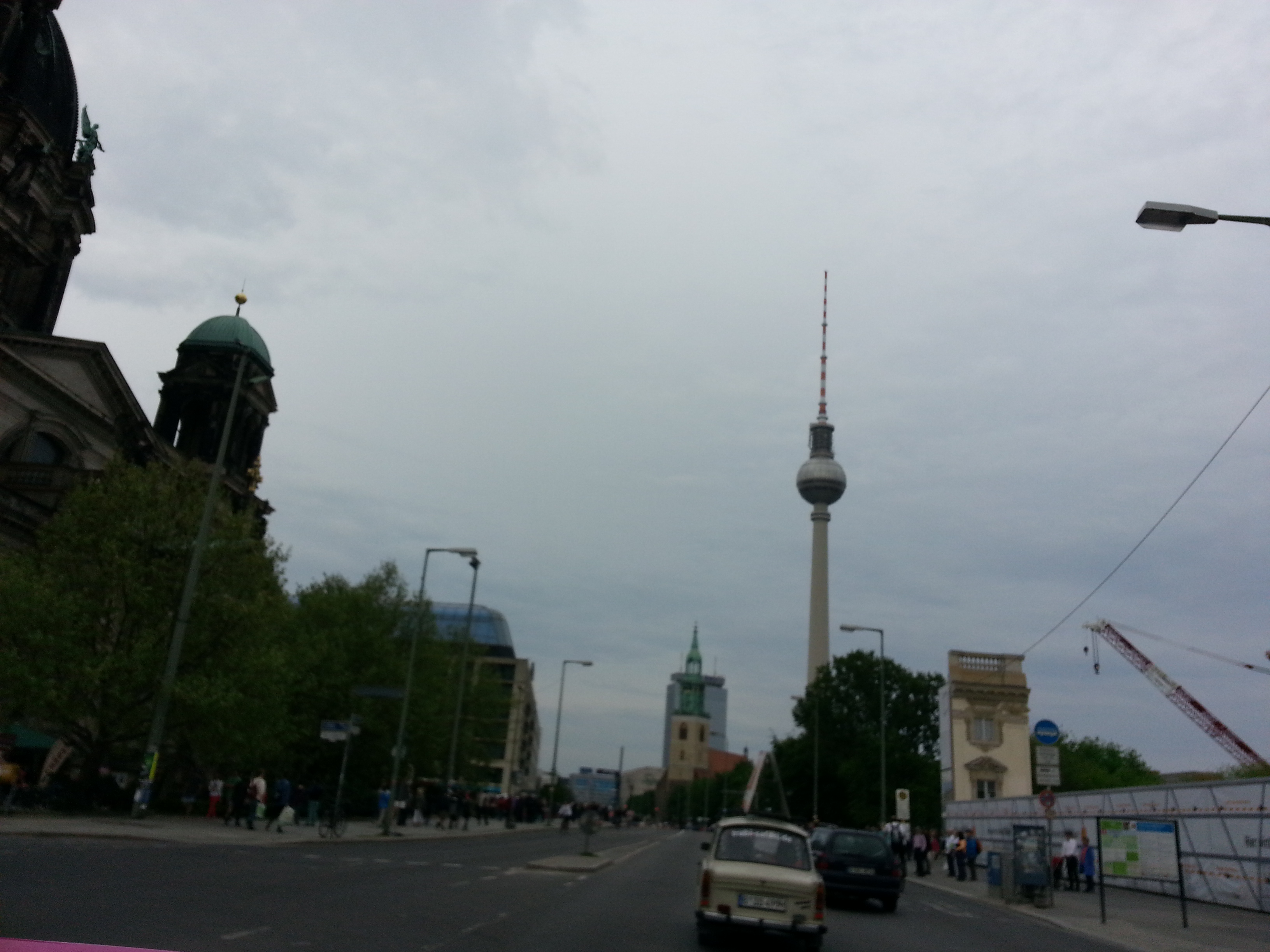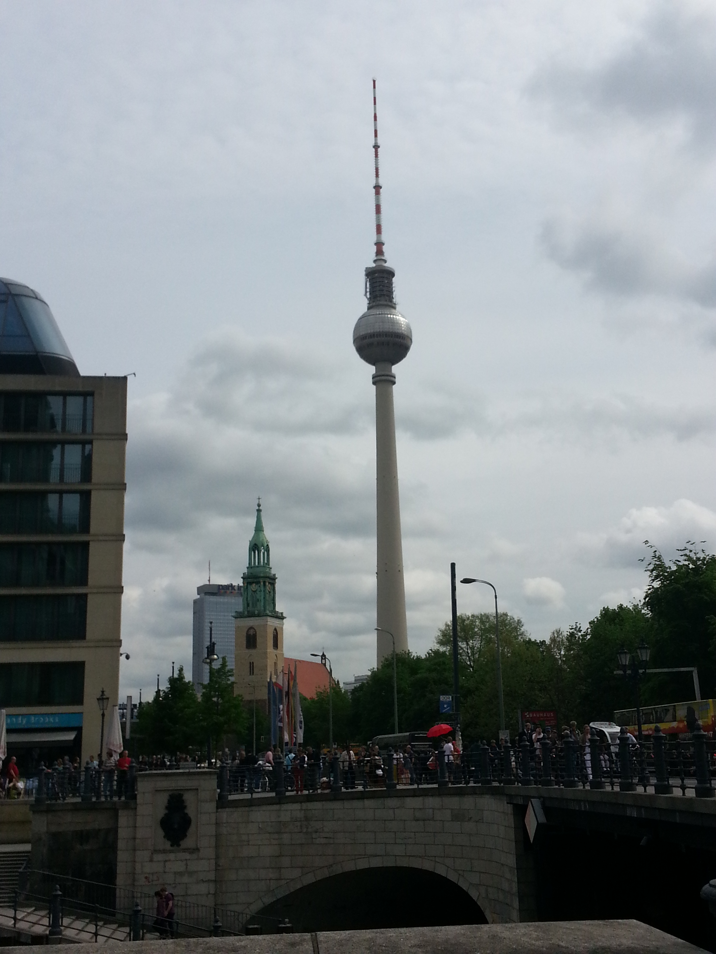 Our hotel was on the East Berlin side at the Holiday Inn at Alexanderplatz. Alexanderplatz is one of the main stations in the city and usually has a lot of street performers in the area. In this picture is the old Television Tower that was used while the wall was still up. You can climb to the top to see a lovely panoramic view of the city.